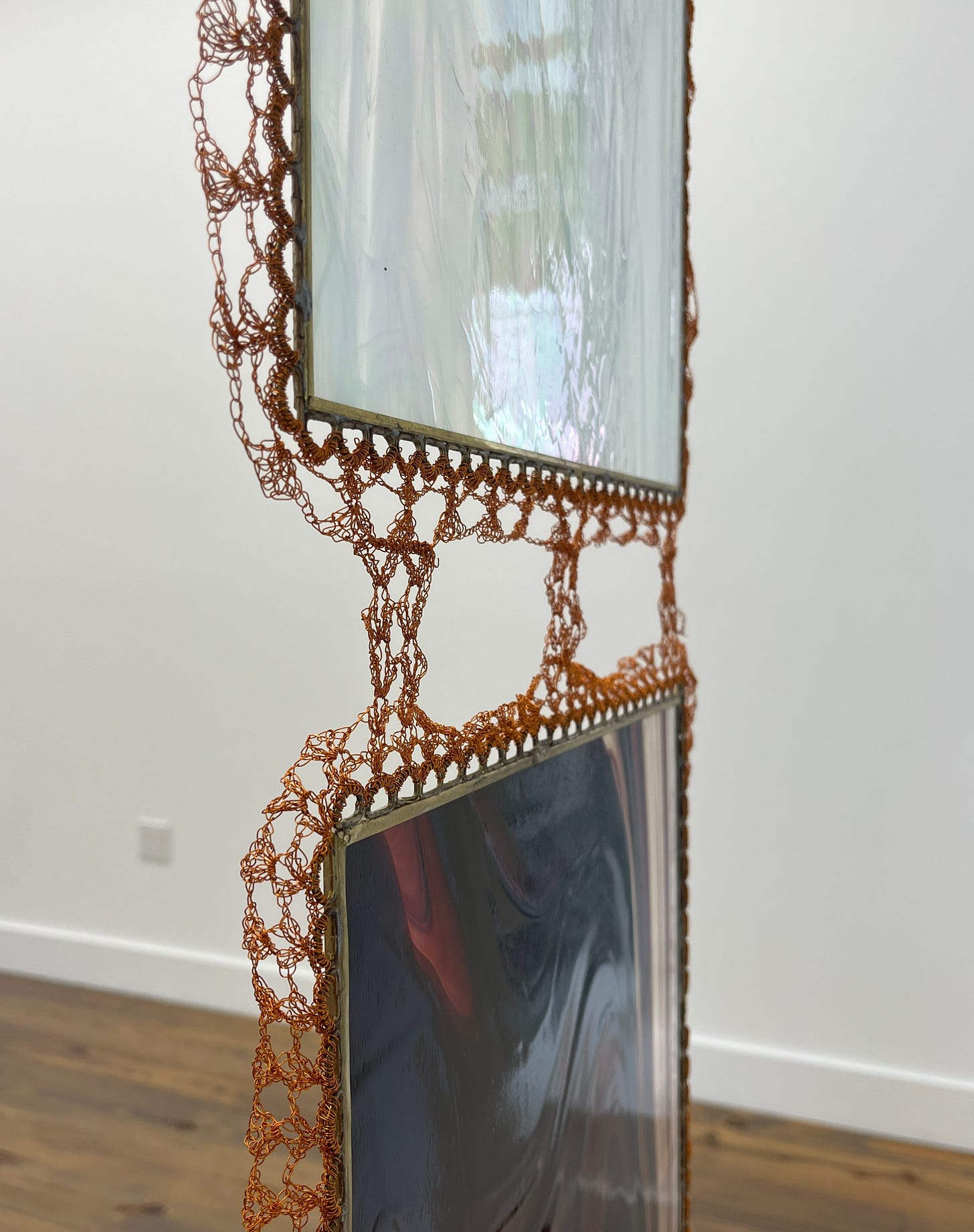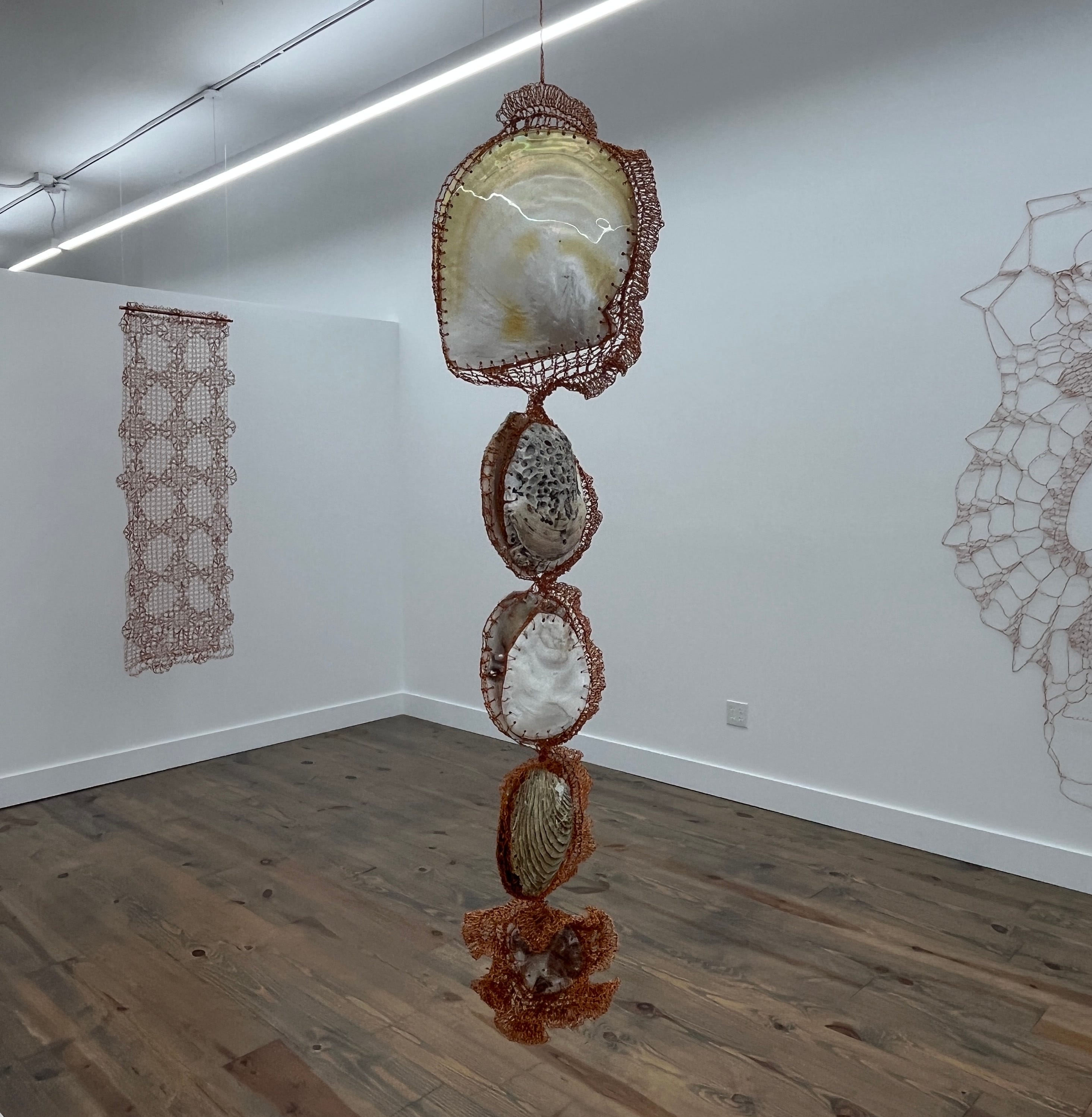 The gestures at the “minor,” the “queer,” the “diminutive,” the “secondary,” even the “lower case” all smack of the academy and the museum, not the Mexican border, or some domestic scene. The work rather reinforces the hierarchies that its ventriloquists chatter about it challenging: soft work made hard because the artist chooses copper instead of thread; hard material rendered soft because put in the service of (feminine) artisanal traditions; raffia yarn, because, you know, crochet; abalone shells because, you know, shimmer. It’s all so prosaic, even as it desperately wants to say something, to be something, poetic.